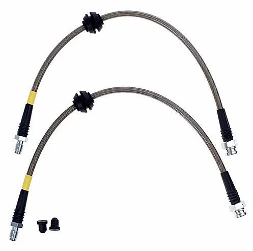 Stoptech® Stainless Steel Braided Brake Lines provide a quicker, firmer, more consistent pedal response by maintaining consistent brake pressure. Additionally, stainless steel lines provide precision brake modulation, especially during threshold braking. The improvement in pedal feel is more dramatic on older vehicles where the factory rubber line may have softened and swelled due to age.